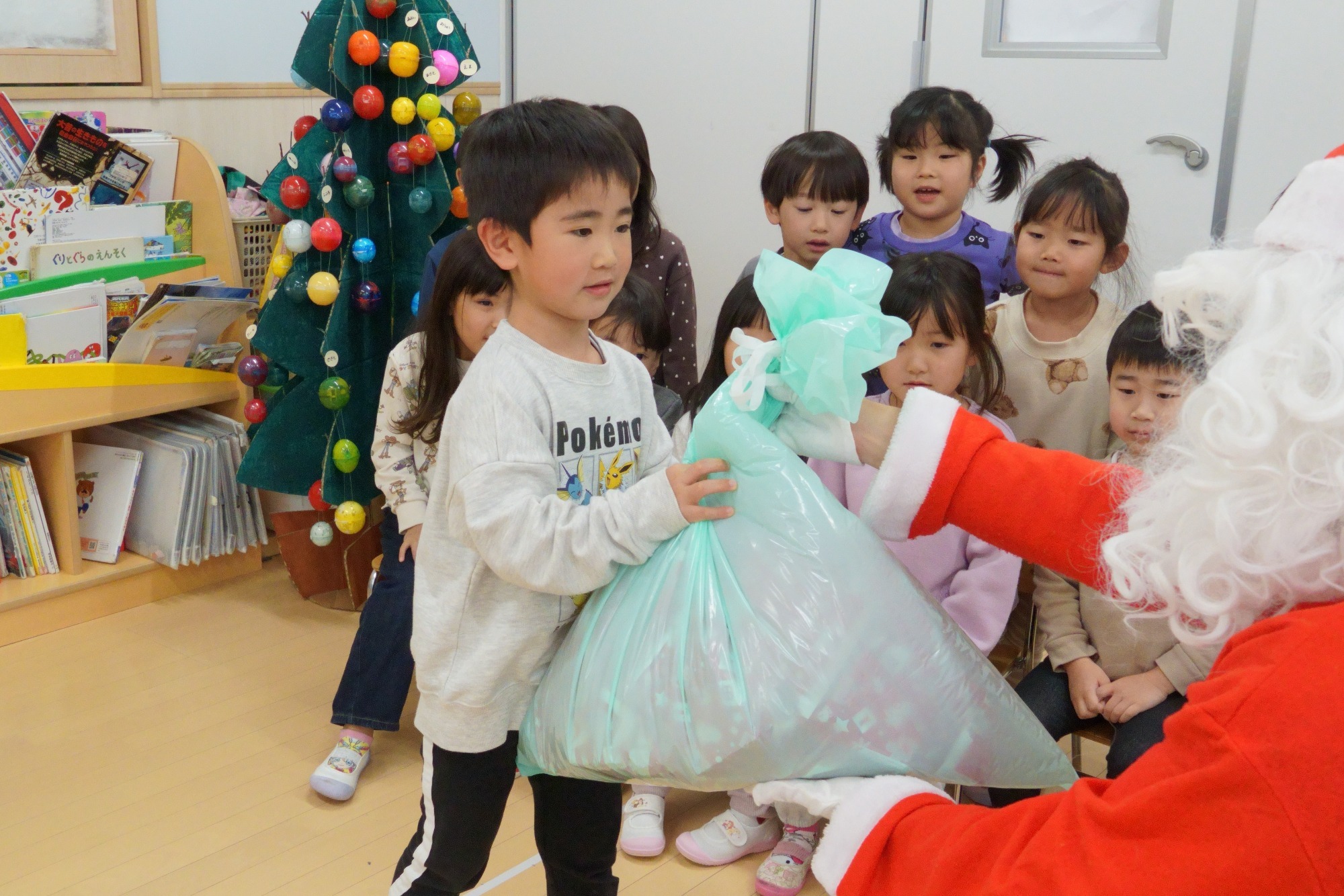 歌をうたったり職員によるハンドベルの演奏を聴いた後には、待ちに待ったサンタさんの登場!