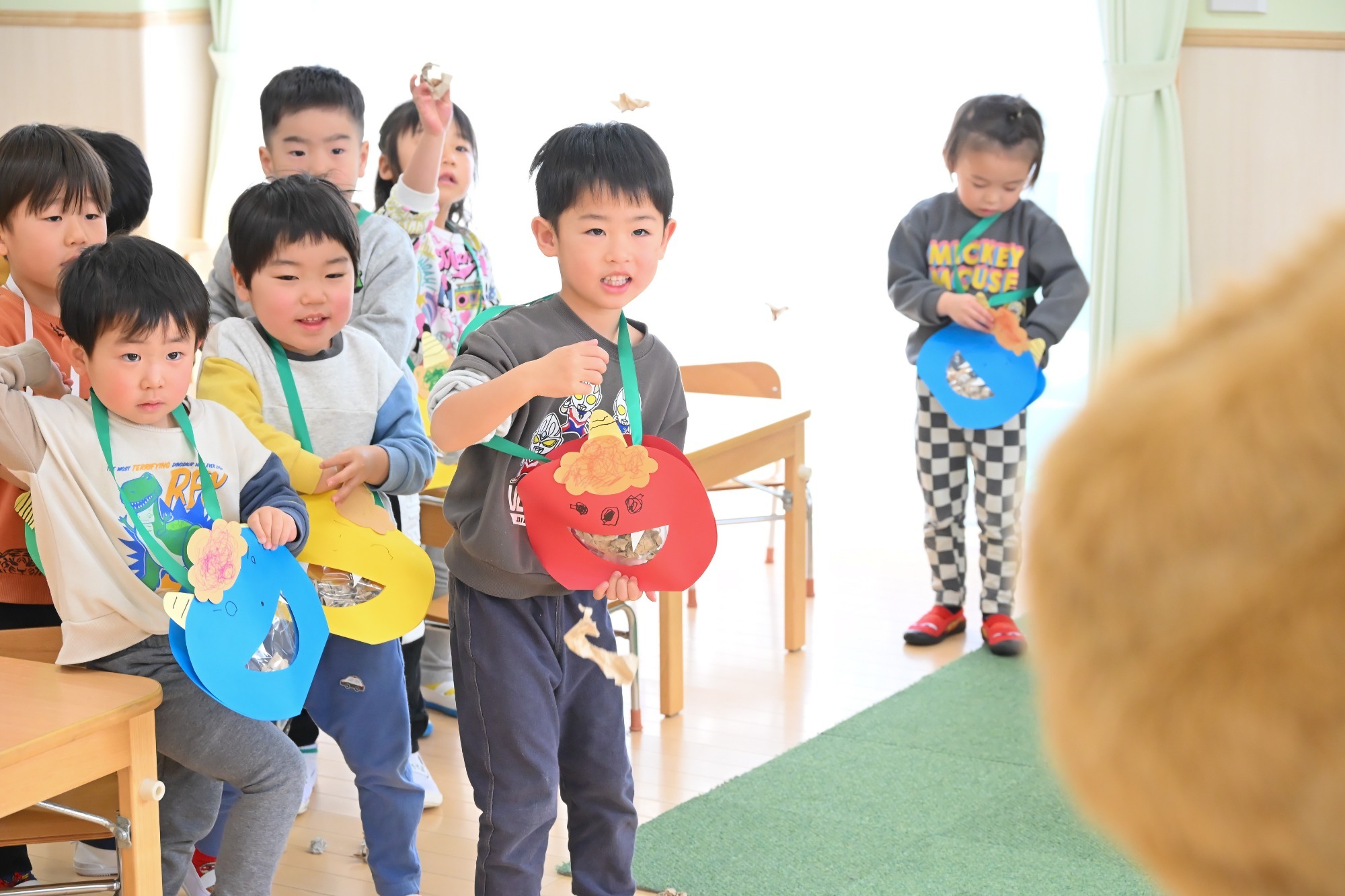 2~5歳児クラスでは自分たちで鬼退治!「鬼は~外!」「福は~内!」と元気な声を響かせていました。